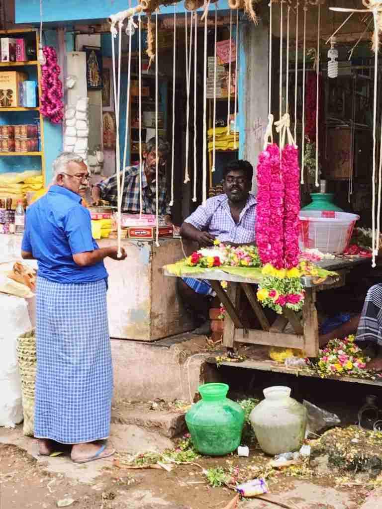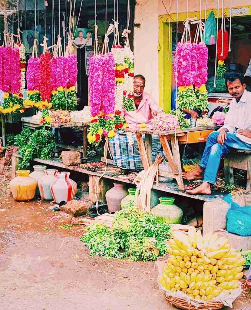 שוק הפרחים במדוראי הוא ללא ספק אחד המקומות הצבעוניים ושוקקי החיים בעיר. פרח היסמין, שהוא סמלה של העיר מדוראי, הוא ללא ספק "מלך השוק". פרחי היסמין של מדוראי נחשבים לזן בעל ניחוח חזק ביותר עם חיי מדף ארוכים ולכן הם הפכו לחומר גלם מבוקש מאד בתעשיית הבשמים העולמית. אני מזמינה אתכם לקרוא בהרחבה על שוק הפרחים של מדוראי בפוסט שלי על אומנות ואמונות – אומנויות מסורתיות בדרום הודו.