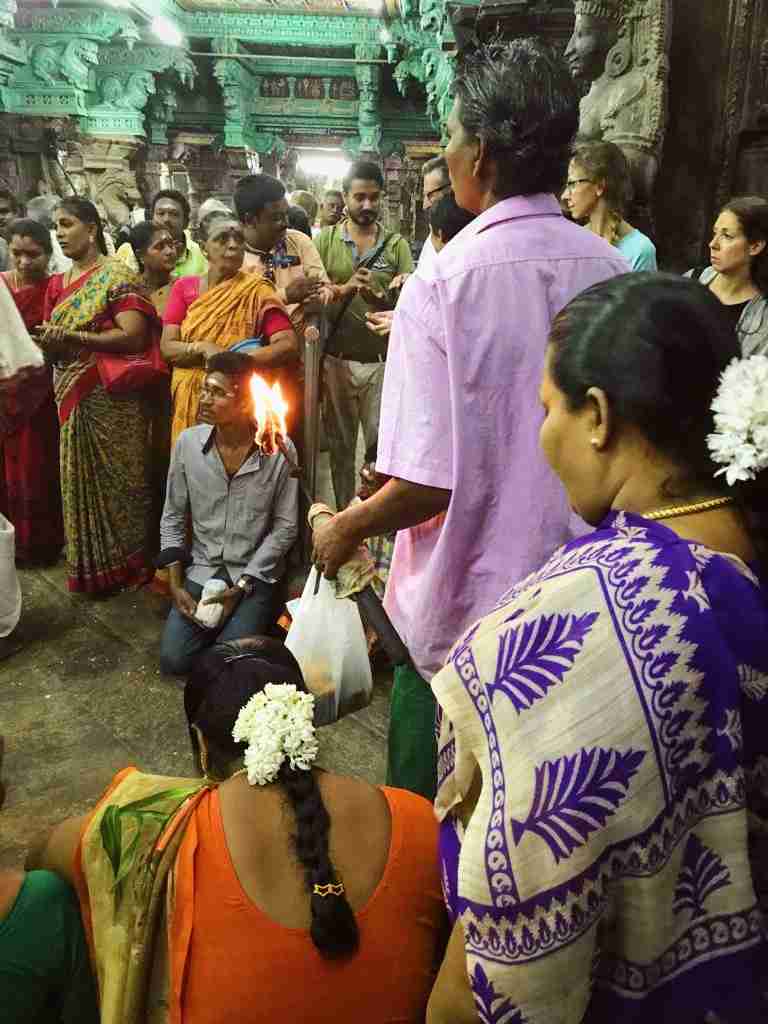 בכל מקום אנחנו אוספים רגעים קסומים. אני אספתי לי כמה ממש שם. כשביקרתי שוב אחרי כמה חודשים, עם קבוצת נשים מקסימה (על המסע הבא שלנו לדרום הודו), מישהו פתאום ניגש אליי, עם אותן פנים עגולות וחיוך מוכר. אותו מוכר בדים שקניתי אצלו ערמות בפעם הקודמת. איזו הרגשה… תחושה נהדרת של להיות במקום מוכר. הפעם לא יכולתי לקנות אצלו שוב. כמה שבועות לפני שהגענו, המקום כולו נשרף, הדוכנים, הסחורה. אזור שוק הבדים שמתחת למקדש שינה את פניו. אבל המציאות מחייבת התחלות חדשות והחיוך על הפנים נשאר. גם תמונת סלפי משותפת.